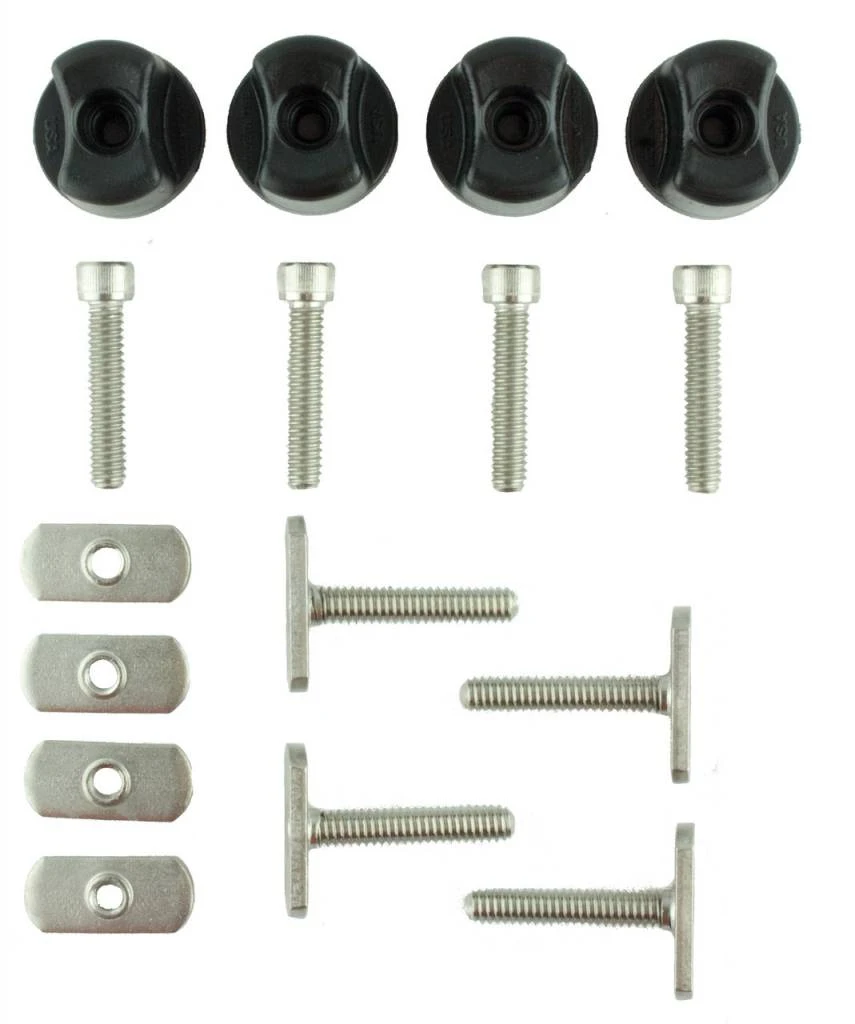 Here is a convenent YakAttack – GearTrac Hardware Assortment Kit includes four of each: Threaded Knobs, 1-1/2″ Mightybolt, Track Nuts, 1-1/4″ Socket Head Cap Screws, All Standard 1/4-20 Thread. Â